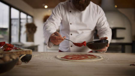 Professional cook making pizza in culinary kitchen. Close up chef man hands spreading ketchup in professional restaurant. Baker guy putting tomato sauce on raw dough bread in cafe. Food meal concept.