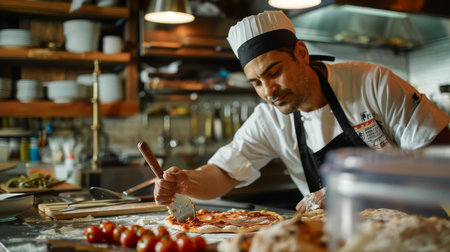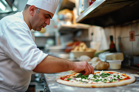 Pizza chef finishing the preparation of a tasty pizza in a professional pizzeria restaurant kitchen.