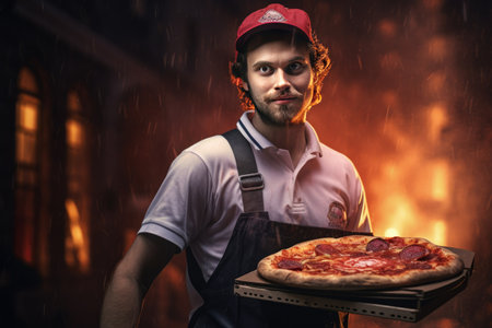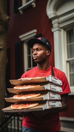 Pizza delivery man ready to pizza boxes to customer. Food delivery service, pizza for young man at home Ai generated