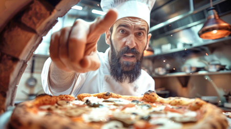 A skilled chef carefully pulls a freshly made pizza from a wood fired oven capturing the essence of Italian cuisine.