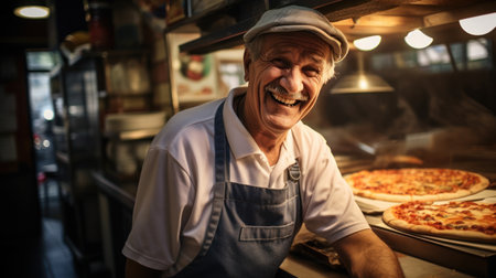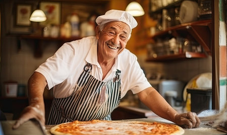 Elderly owner baking fresh pizza in his pizzeria. Elderly pizzaiolo making a pizza at the bakery on sunny day. Generative AI.