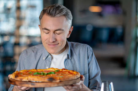 A man sitting in a cafe and getting ready for eating a delicious pizza