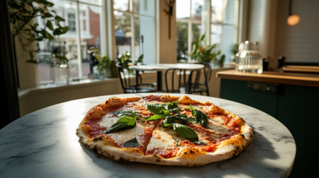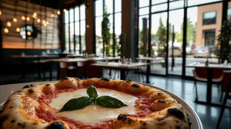 A classic Margherita pizza with fresh basil in modern urban restaurant