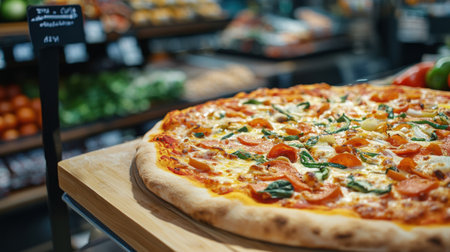 Freshly baked large pizza features a golden crust and colorful toppings displayed on a wooden tray in a trendy grocery store setting.