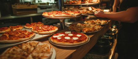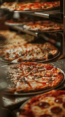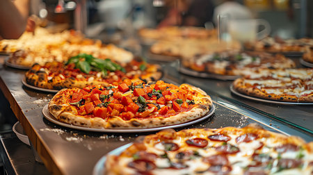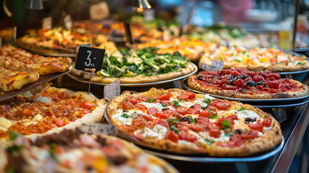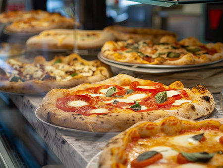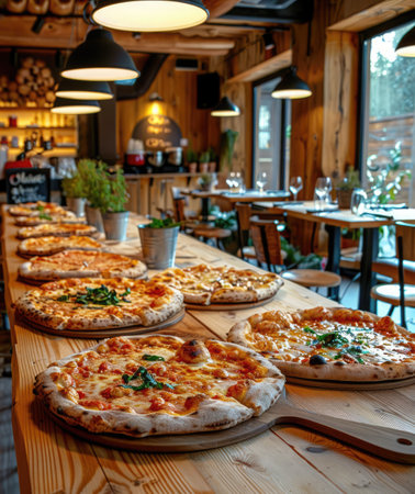Delicious pizza selection local pizzeria food display cozy atmosphere close-up view culinary delight