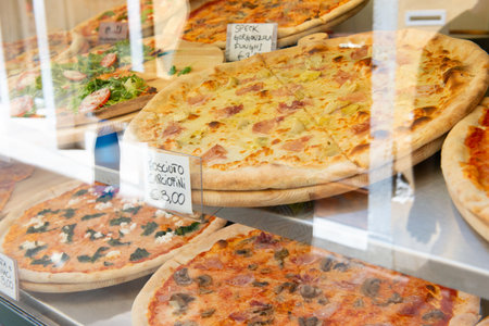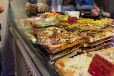 Different types of pizza are sold in a street food cafe in Italy