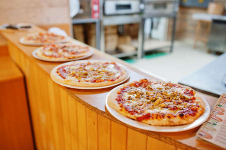 Pizzas displayed for sale in a shop window, close-up of delicious fast food.