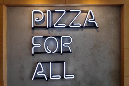 A white neon light on a wall saying: Pizza for all.