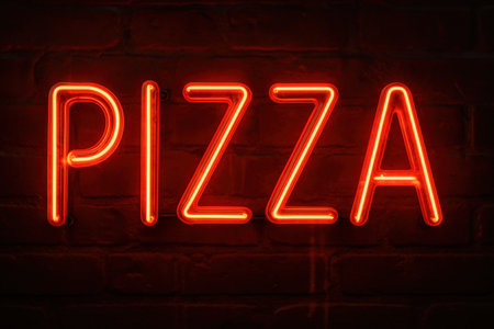 Vibrant Red Neon Pizza Sign Glowing on Dark Brick Wall