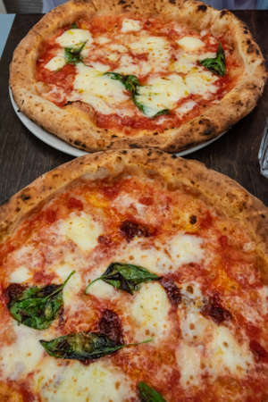 Two freshly baked napolitano pizzas on a table