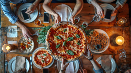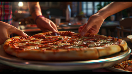 A freshly baked pizza, topped with pepperoni and cheese, sits on a silver platter in the middle of a table. Two hands reach towards it, ready to take a slice. The setting is a casual restaurant, illuminated by warm lights and the glow of the evening.