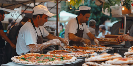 Pizzamakers preparing pizza at a food festival