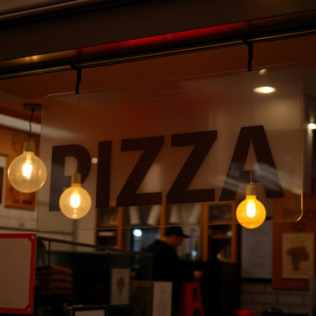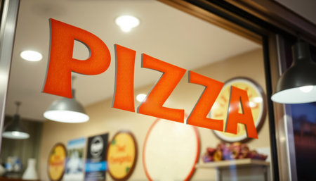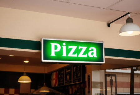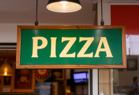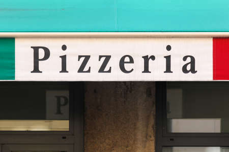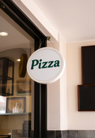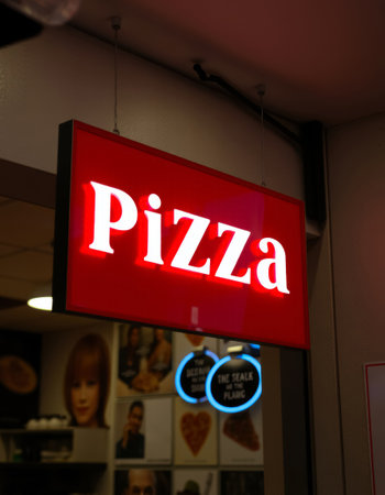 Pizza sign in a restaurant. Italian fast food restaurant chain.