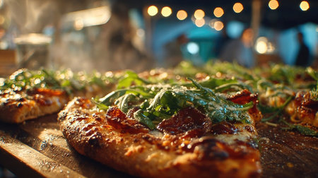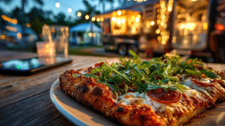 A close-up view of pepperoni pizza garnished with fresh greens, served at a lively food truck gathering during a warm evening, creating a cozy atmosphere.