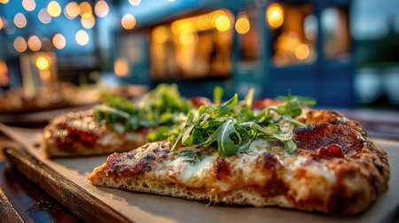 A vibrant pizza slice topped with fresh herbs sits on a wooden table, capturing the essence of outdoor dining with festive bokeh lights in the background.