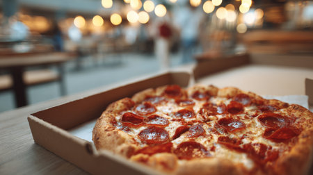 A mouthwatering close-up of a pepperoni pizza in a delivery box showcases its rich toppings and crispy crust, set against a warm, inviting restaurant backdrop.