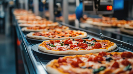 A series of freshly baked pizzas are moving along a conveyor belt in a modern food production facility. The vibrant colors and appetizing toppings showcase the art of pizza making.