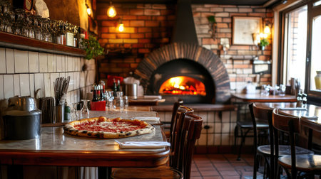 Charming interior of an Italian restaurant featuring a rustic pizza oven and a beautifully set table. Perfect for food lovers seeking a warm dining experience.