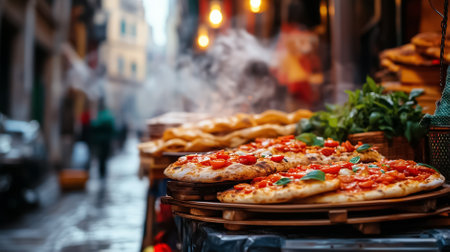 Colorful street life in Naples showcases vendors presenting steaming flatbreads adorned with fresh tomato sauce. The aroma fills the air, inviting passersby to enjoy this local delicacy.