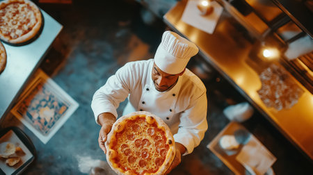 Italian chef holding a pizza in a cozy café, smiling warmly