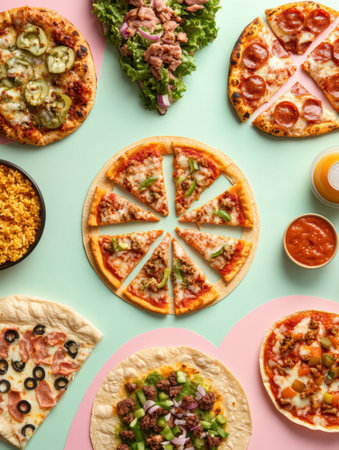 A delightful features spread tacos, pizza varieties, and sides artistically laid out, inviting enjoyment for street food lovers.