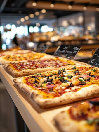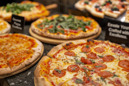 An array of gourmet pizzas with exotic toppings on display, each reflecting the artistry of culinary craftsmanship. The warm, inviting ambiance enhances the pizzas' appeal