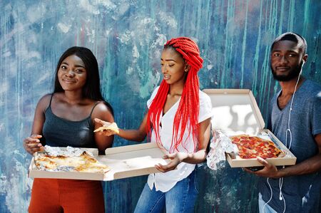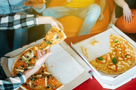 Pizza time. Youth eating habit. Business team lunch. Group of colleagues friends relaxing with unhealthy delicious meal.