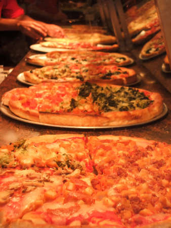 perspective view closeup of different kinds of pizza on wooden plates on the shelves of street food shop window