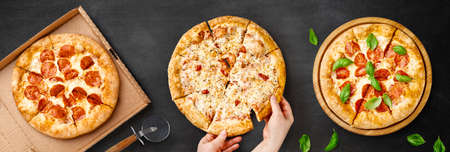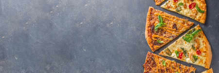 Various italian american traditional pizza slices. Slices of delicious pizza on dark gray concrete background, top view flatlay