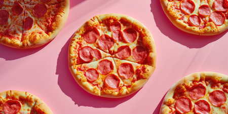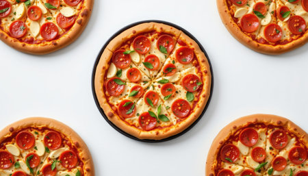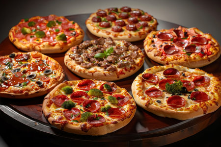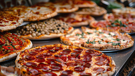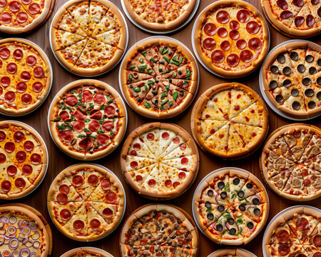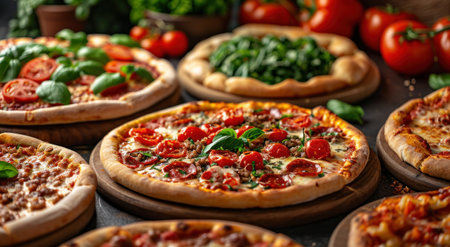 A top view of an array of delicious homemade pizzas, featuring various toppings and flavors, perfect for a culinary feast or food photography.