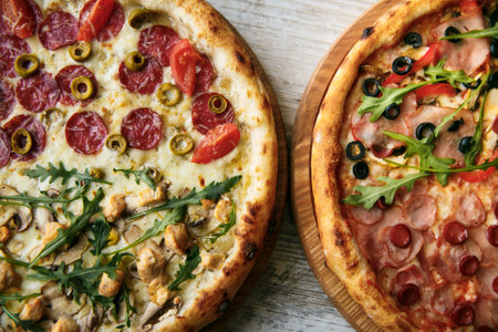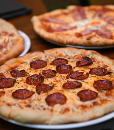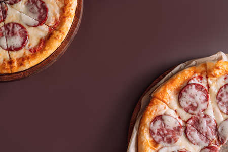 Hot delicious pizzas, top view. Pepperoni on wooden table. Tasty italian food.