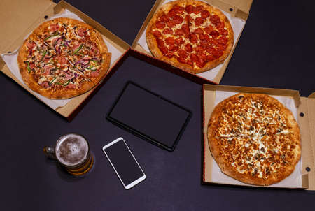Pizza delivery. Open boxes, beer mug, tablet and smartphone with blank screen on dark background. Call or order online on tablet, mobile, cellular, smart phone. Top view, copy space.