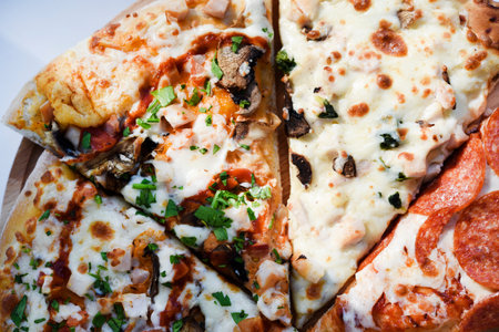 Assorted pizza toppings on a thin crust. Particularly popular in its New York and Chicago styles, pizza is a go-to comfort food.