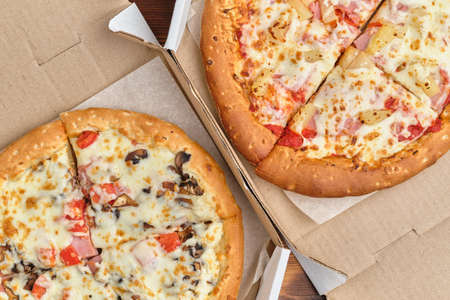 Carbonara and hawaiian pizza in a cardboard box with a top view.