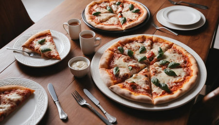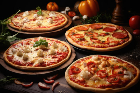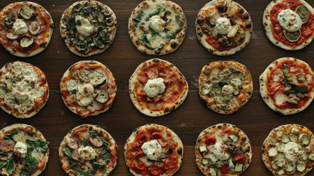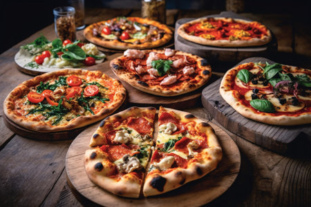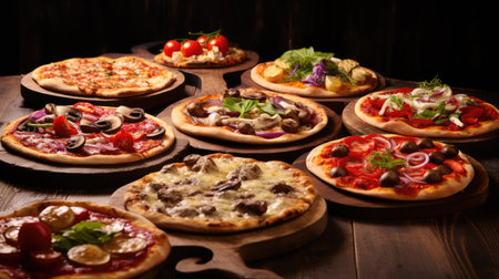 Overhead View of Variety of Delicious Pizzas on Wooden Table, Perfect for Food Photography