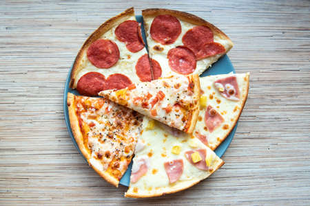 Assorted pizza slices. Margherita, pepperoni, four cheese pizza. Top view. Different types of pizza on the textured old wooden table.