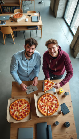 Two cheerful men, one with dark hair in a light blue shirt and the other with blonde hair in a maroon hoodie, share delicious pizzas in a stylish office setting. The scene captures a moment of friendship and joy, highlighting the camaraderie and casual atmosphere of enjoying food together amidst laptops and a bright, inviting space.