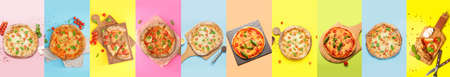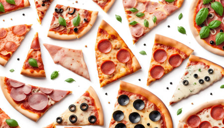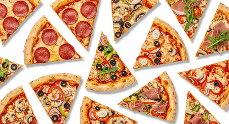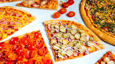 Various italian american traditional pizza slices. Slices of delicious pizza on light background, top view flatlay