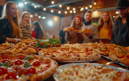 Group of friends eating pizza in a pizzeria. Selective focus.