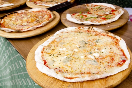 Discover a beautiful array of gourmet pizzas arranged on a rustic wooden table, showcasing vibrant toppings and fresh ingredients perfect for any culinary enthusiast.