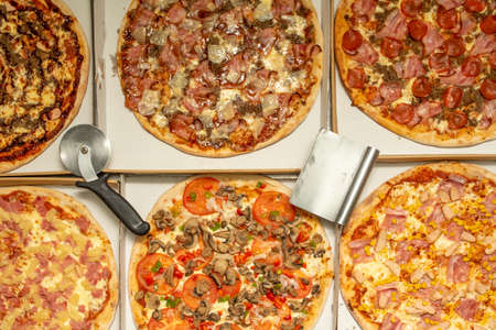 Various pizza assortment on chalkboard dark background. Top view of pizza in cardboard package.