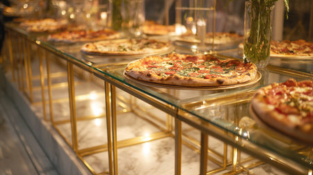A row of delicious gourmet pizzas with various toppings, arranged on a luxurious glass and gold buffet table. The setup suggests high-end catering for a party, wedding, or exclusive event.
