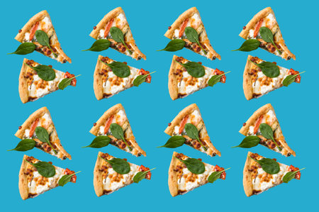 three slice of hot fresh pizza lies on a blue background. Top view, flat lay. Banner.