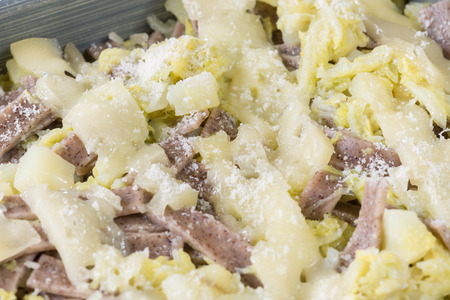 Pizzoccheri. Typical Italian dish from Valtellina. Baking dish of pizzoccheri ready to bake