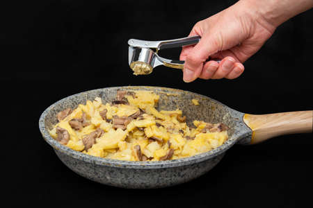 Female hand crushes garlic through a juicer in a fried potato with mushrooms in a gray with spots pan on a black table, close-up, black background