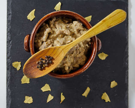 Beef stroganoff in a clay bowl decorated with bay leaves and a spoon. Top View