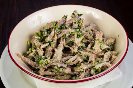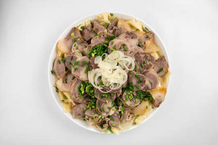 Top view on kazakh national festive dish beshbarmak with horse meat kazy and boiled dough, horizontal