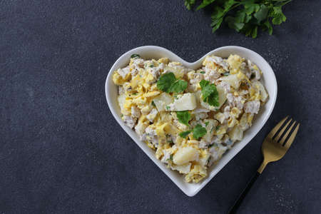 Salad with pineapple, baked chicken and omelette in heart shaped plate on a dark gray background