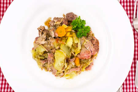 Beef meat stewed with potatoes, dill, sauce and carrots in cast iron pan