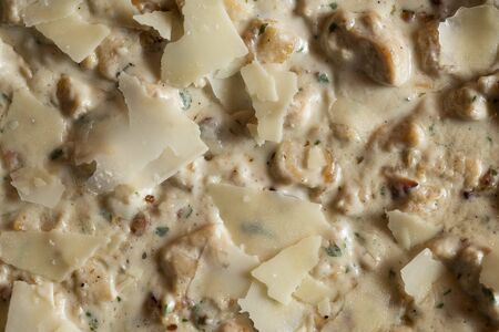 Traditional Italian Potato gnocchi with trumpet and champignon mushrooms, cream, fresh parsley served with grated Parmesan cheese. hot pot main dish on wooden board with spices. Restaurant menu dish